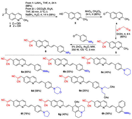 For the preparation of the target compounds, we employed the four-step route shown in Scheme 1, which, for higher efficiency, was designed to generate structural variability at the last step. The starting materials were the commercially available C-6 functionalized quinolines 1 and 2. In the case of ester 1, treatment with lithium aluminum hydride in tetrahydrofuran (THF) gave alcohol 3 in 88% yield. On the other hand, the carboxylic acid derivative 2 needed to be first activated by its transformation into a mixed anhydride by treatment with ethyl chloroformate, followed by in situ NaBH4 reduction to give 3 in 58% yield. This alcohol was next oxidized with manganese oxide suspended in dichloromethane to give aldehyde 4 in 80% yield. All attempts to directly transform 1 into 4 by partial reduction with DIBAL were unsuccessful. The Knoevenagel condensation of 4 with malononitrile afforded an 80% yield of compound 5, which was finally coupled with several aromatic aldehydes bearing a p-disubstituted amino group through an aldol condensation promoted by acetic anhydride and zinc chloride as a Lewis acid catalyst [52], to give the desired derivatives 6. These compounds showed an excellent stability, even upon long-term storage, which allowed their photophysical and pharmacological characterization through the studies described below.
