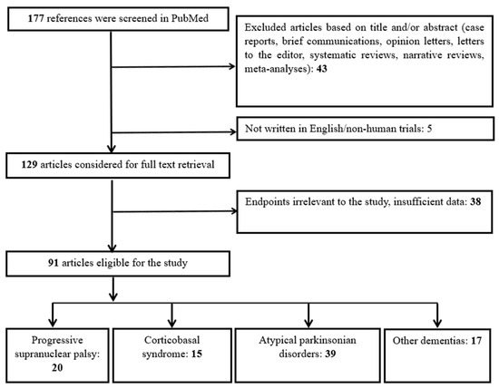 As depicted in Figure 3, our algorithm initially yielded 177 results. Five studies were excluded due to being either non-English or not involving human subjects. Forty-three articles were excluded as they were reviews, meta-analyses, case reports, opinion papers, or editorials. This left 129 studies for the full-text review. Following this, 38 studies were excluded for being irrelevant to the purpose of our review. Ultimately, 91 studies were eligible. These 91 studies were categorized as follows: (a) 20 studies included only patients with PSP, (b) 15 studies included only patients with CBS, (c) 39 studies involved patients with APDs, including subgroups of PSP and/or CBS, and (d) 17 studies compared patients with PSP and/or CBS to individuals with FTD, AD, or other dementias.