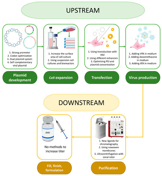 Enhancing the AAV yield can be achieved by improving and optimizing the transfection process. However, there is evidence that with a transfection efficiency of 60%, only about 7% of cells in a triple transfection model produce measurable amounts of assembled AAV capsids. Interestingly, co-transfection with an infectious AAV2 clone and a helper plasmid increases the proportion of cells positive for assembled AAV capsids by 4–5 times [94]. One approach to improving this step involves replacing plasmid-based transfection with the use of herpes simplex virus (HSV). AAV producer cell lines were infected with HSV at a multiplicity of infection (MOI) of 12. The producer clones generated approximately 1.6 × 104 AAV9 virions per cell. These results demonstrate the higher efficiency of this method compared to plasmid-based transfection, along with its scalability and equal effectiveness in both adherent and suspension cultures [95].