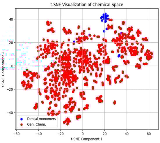 This observation is further confirmed with t-SNE visualization as shown in Figure 1 and Figure 2. Analysis of the t-SNE plots reveals that the monomers in question occupy a peripheral position within the chemical space, situated at the boundary of the main cluster. Although they do not form a distinct cluster, their proximity to the main group indicates some degree of similarity with the other monomers. However, their relative distance from the central cluster suggests that they may exhibit unique behavior, warranting separate consideration in modeling efforts.
