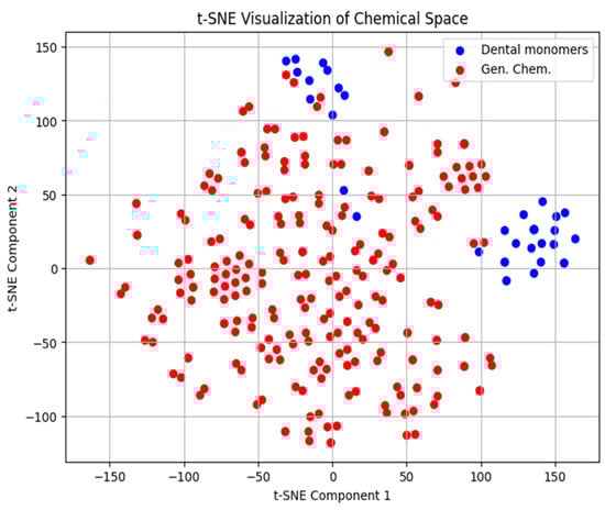 The within-group analysis of dental monomers revealed a high average similarity of 0.40, indicating a relatively low chemical diversity within this group. In contrast, the average similarity within the dataset of small organic molecules was significantly lower, with values of 0.11 for density and 0.12 for surface tension. These results suggest that the dental monomers exhibit a relatively narrow chemical diversity.
