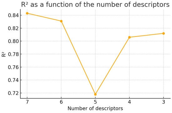 The final descriptors of the four models (two MD-based density and two MD-based surface tension models based on dental monomers dataset or OCHEM datasets), along with the permutation analysis [,] results, are shown in the Table 3. Permutation importance describes how the changes in the descriptor value influence the model predictions, while Random Forest (RF) importance concentrates on how often the feature is used in determining the model. While the curse of dimensionality describes a continuous challenge, practical performance degradation due to increasing data sparsity and computational demands often becomes notably pronounced in machine learning models when the number of features exceeds approximately six, necessitating significantly more data for effective modeling. Therefore, six features were used initially for modeling. To validate whether adding more descriptors would lead to better model performance, experiments with other possible descriptor amounts among the input were conducted for the dental monomers dataset, revealing very similar performance in both scenarios. Figure 3 shows the R2 of dental monomers models in relation to the number of parameters. It can be seen that decreasing the number of descriptors yields slightly worse statistical parameters of the model, yet still at a satisfactory level. Decreasing the number of descriptors from six to five results in the largest drop in R2 value. It is worth noting that the R2 value increases again after further reduction in descriptor number. It could be easily observed that some of the features were shared between models for predicting the same property based on different training datasets. For example, both models for predicting density heavily relied on Autocorrelation of a Topological Structure (ATS) descriptors, regardless of the dataset source. However, that observation was no longer valid for models predicting surface tension. This observation once again suggests that the two datasets differed significantly based on the chemical structural features of the compounds in them.