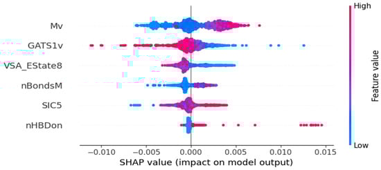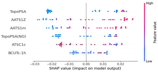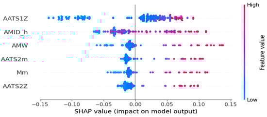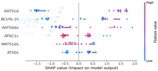 The descriptors used in the four models from the study were calculated from SMILES, therefore they belong solely to 2D categories of molecular descriptors. The following chapter concentrates on the interpretation of the descriptors in the models and the SHAP diagrams shown in Figure 4, Figure 5, Figure 6 and Figure 7. Most of the descriptors used in the study belong to the same category of 2D autocorrelation descriptors, known as Autocorrelation of a Topological Structure (ATS) or Moreau–Broto autocorrelation descriptors. Therefore, to avoid repetition and for ease of reading, the general information about them will be provided in Appendix B and specific descriptors will be discussed afterwards with additional in-depth analysis supplied for both models based on the dental monomers.