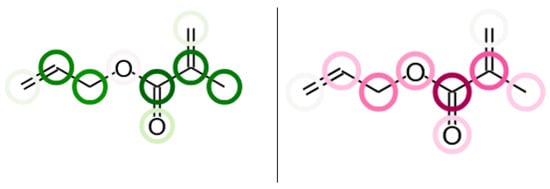 Several structural dependencies can be observed in the models prepared using CircuS 1.2 software, which is explained in detail in Paragraph 4. The color scheme used in this study is based on the two complementary colors—green and red—that are assigned to positive and negative contributions, respectively. The more intense the color, the larger the contribution. Green circles are associated with molecule fragments whose presence increases the analyzed property value and red circles bear the opposite relationship []. In most cases, the molecular fingerprints identified and modelled by the CircuS influence the density and surface tension of dental monomers inversely, which can be observed in the allyl methacrylate molecule, shown in Figure 8. The additional graphical representation of selected monomer structures is available in Table S3 in the ESI. In most structures, there is a visible negative correlation between fragments that increase the surface tension and decrease the density, such as oxygen bridges connecting alkyl chains, ketone groups, or tertiary carbon atoms at the terminal positions in the molecule.