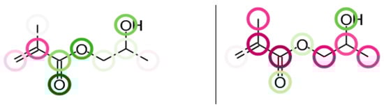 Aromatic rings tend to have a greater influence on the surface tension than on the density, which corresponds with the surface tension models that were more dependent on the intrinsic states of the molecules. There are few exceptions of these observed regularities, and the results show that finding the compound that can be characterized with both the analyzed properties at the low values may prove to be an elaborate task. However, among the mutually exclusive dependencies, the presence of some structural elements was found to be positively correlated with both the surface tension and density. In general, the presence of heteroatoms in forms of hydroxyl and amine groups increases the corresponding properties. Additionally, the methyl group in methacrylates tends to have a stronger influence on the density (decreasing it substantially) than on the surface tension. Both of these findings are visualized in the Figure 9, representing a molecule of 2-hydroxypropyl methacrylate. Therefore, it is worthwhile to take into account the presence of such groups in the process of designing new dental materials in terms of the ergonomics of their utilization.