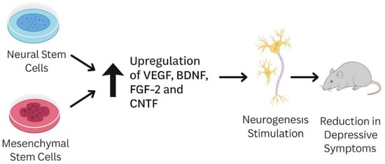 Additionally, stem cells have been shown to promote the proliferation and differentiation of neural precursors in the dentate gyrus, supported by the upregulation of neurotrophic factors such as brain-derived neurotrophic factor (BDNF), fibroblast growth factor-2 (FGF-2), and vascular endothelial growth factor (VEGF) [33]. These growth factors are crucial for synaptic plasticity and structural repair in brain regions implicated in mood regulation, including the hippocampus and prefrontal cortex [56].