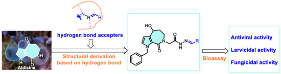Marine natural products have gained increasing interest in drug research and development because of their unique structures, diverse biological activities, and novel mechanisms of action. Using the antiviral alkaloid aldisine as the lead compound and utilizing the hydrogen bond effects common in drug design, novel derivatives containing an acylhydrazone moiety were designed and synthesized. The structures of these derivatives were systematically analyzed using variable-temperature 1H-NMR. Antiviral activity tests showed that most derivatives were active against tobacco mosaic virus (TMV), with some compounds outperforming the commercial antiviral drug ribavirin. Notably, 3-methylphenyl- and 3-pyridyl-substituted acylhydrazones 5-6 and 5-12 displayed activity comparable to ningnanmycin, one of the most effective commercial antiviral agents. Molecular docking results indicated that incorporating the acylhydrazone moiety enhances hydrogen bonding between the molecules and target proteins. Additionally, we evaluated the fungicidal and larvicidal activities of these derivatives. Most exhibited significant larvicidal effects against Mythimna separata and Plutella xylostella, along with broad-spectrum fungicidal activity. Four related compounds (5-11, 5-12, 5-13, and 5-17) exhibited high fungicidal activities, and another four compounds (2-4, 5-6, 5-13, and 5-17) exhibited high larvicidal activities.