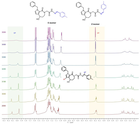 At room temperature, the proton NMR and carbon NMR spectra of all synthesized acylhydrazone compounds (5-1–5-16) exhibited two sets of peaks. We propose that the possible reasons for this phenomenon are the E-Z isomerism of the acylhydrazone chain, specifically the mixture of (4RS, E)- and (4RS, Z)-configurations. It is generally believed that the E-isomer is the product of thermodynamic control. Kinetic control is governed by activation energy (favoring faster formation), while thermodynamic control is governed by product stability (favoring the lower-energy isomer at equilibrium). Variable-temperature NMR experiments (293–353 K) were conducted to clarify the mechanism (Figure 2). For compound 5-2, the proton signal of Hb (pyrrole 3-position hydrogen) in the 1H-NMR spectrum gradually transformed from a quartet (two sets of peaks) to a doublet (one set of peaks) with increasing temperature (Figure 2). Meanwhile, the proton signal of Ha (aldimine hydrogen) gradually changed from a doublet (two sets of peaks) to a singlet (one set of peaks) as the temperature rose. These results confirmed that the E-Z isomer mixture of 5-2 converted to a single E-isomer during heating, indicating that the E-Z isomerism of the acylhydrazone chain is responsible for the appearance of two sets of peaks in the NMR spectra at room temperature.
