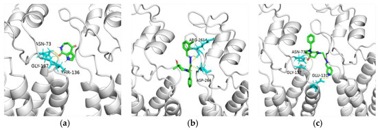 Molecular docking results of aldisine (a), compound 5-6 (b), and 5-12 (c) with TMV CP. In the figure, silver gray represents the capsid protein, light blue represents amino acid residues, and the remaining colors represent small molecules.