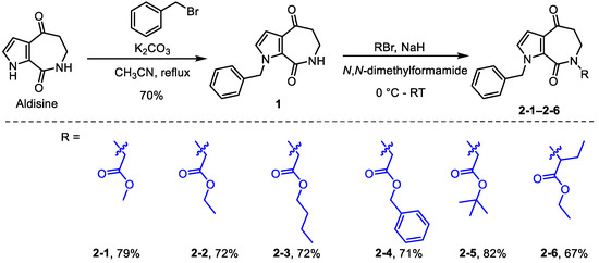 Under alkaline conditions, aldisine underwent a regioselective nucleophilic substitution reaction with benzyl bromide, forming derivative 1. Subsequently, using sodium hydride as the base, derivative 1 reacted with α-bromoesters in a nucleophilic substitution reaction to produce the alkoxycarbonyl methyl-substituted derivatives from 2-1 to 2-6 (Scheme 1).