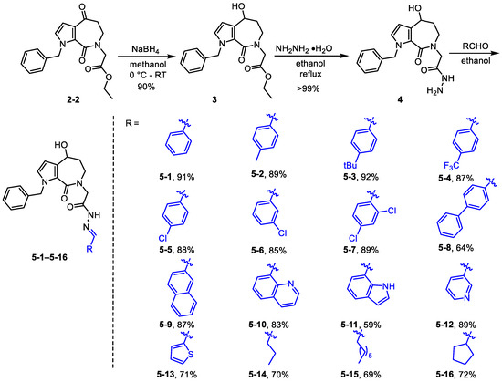 Starting with aldisine derivative 2-2, alcohol derivative 3 was produced through reduction with sodium borohydride. The ester group in alcohol 3 underwent amide formation with hydrazine to produce the acylhydrazide derivative 4. Next, derivative 4 underwent a condensation reaction with aromatic or aliphatic aldehydes to create hydrazone derivatives from 5-1 to 5-16 (Scheme 2).