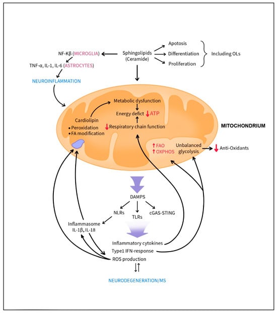 Dysfunction in metabolic and mitochondria dynamics boosts neuroinflammation and neurodegeneration observed in MS. Mitochondrial release of DAMPs triggers NOD-like receptors (NLRs), Toll-like receptors (TLRs) and cGAS-STING activation and promotes inflammatory cytokines, chemokines, and reactive oxygen species production. Proinflammatory cytokines cause mitochondrial imbalance. Type 1 IFN responses affect oligodendrocyte (OL) glycolysis and unbalanced glycolysis lowers the expression of anti-oxidants. Cardiolipin, an unsaturated phospholipid in the inner mitochondrial membrane, is especially vulnerable to reactive oxygen species (ROS). Its peroxidation and fatty acid arrangement and modifications are associated with metabolic dysfunction and energy crisis. Energy deficits further trigger the inflammatory responses and neurodegeneration. Upregulated ceramide levels (e.g., sphingolipids) activate NF-κB signal transduction, shifting the glial response towards inflammation and prompting the release of pro-inflammatory cytokines from astrocytes. This skewing of immune responses towards neuroinflammation can affect apoptosis, differentiation and proliferation of OLs.