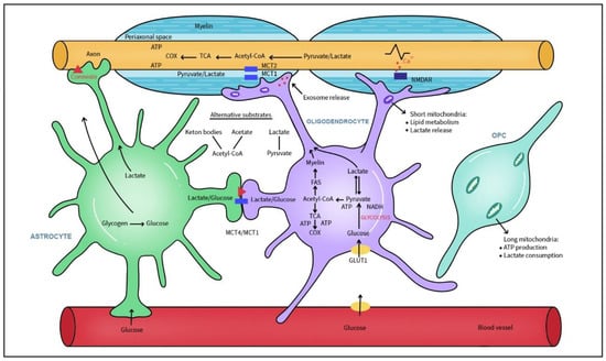 Most OLs generate up to 100 membrane turns in a relatively short time and require high energy expenditure, with about 6.84 × 1021 ATP molecules to produce 1 g of myelin protein, 48-fold of that per 1 g of lipids [125]. This high energetic demand is provided by long, tubular mitochondria able to ensure effective, high rate OXPHOS that takes place before and during the myelination process [126]. Interestingly after myelination is complete, OLs rely less on mitochondrial respiration. In contrast to neurons, mature oligodendrocytes have low OXPHOS and higher glycolytic rate as supported by studies with knocked out OXPHOS in OLs [118]. Lack of OXPHOS in developing OLs led to severe demyelination in contrast with mature OLs which showed no effects on myelin or axonal function. Thus, it appears that mature OLs switch to a glycolytic state that provides the lactate to underlying axons via the myelin sheath. After myelination is complete, mature oligodendrocyte mitochondria are reduced in number and size. Mitochondria are also present within the myelin sheath, but their low density and small size indicate they are not important for OXPHOS, with the suggestion that those mitochondria are specialized for lipid metabolism and Ca2+ homeostasis [126]. While mature oligodendrocytes typically contain smaller and fewer mitochondria under physiological conditions, several studies have shown that mitochondrial biogenesis and size increase during progressive MS, likely as a compensatory response to energy failure and axonal damage [127,128]. Glucose is the main energy source during myelination process but OLs can also use lactate not only for ATP generation but as a precursor of lipids for carbon skeletons to synthesize myelin lipids [129,130]. Additionally, oligodendrocyte progenitor cells use lactate for differentiation and propagation [131]. Under low glucose availability, OLs change their metabolism from glucose to lipid metabolism based on FAs mitochondrial β-oxidation to create acetyl-CoA, a substrate for mitochondrial OXPHOS. In this scenario, lipid-rich myelin itself becomes a local energy reserve. FA oxidation that involves mitochondria and myelin-associated peroxisomes contributes to energy generation in OLs, but also to axonal ATP and conductivity. In a mouse model, reduced glucose availability caused a decline of GLUT1 and the gradual loss of myelin in a range of neurodegenerative diseases with underlying hypometabolism. In the starved Drosophila brain, neurons of the fly olfactory memory center import MCTs ketone bodies (such as acetoacetate and β-hydroxybutyrate provided by the cortex glia) that use their own lipid stores as an energy substrate to sustain aversive memory formation [132].