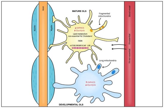 Myelination process relies on continuous lipid synthesis. The mTORC1/SREBP/SCAP axis as well as LXRs comprise key nuclear transcription factors in lipid and cholesterol homeostasis and are essential for endogenous lipid biosynthesis and myelination by OLs. Essential and non-essential FAs are derived from blood circulation or horizontal passage from local cells. FA synthase (FASN), an enzyme necessary for production of longer FAs is critical for timely onset of OL myelination and subsequent radial growth of CNS myelin. In contrast to developing OLs, mature OLs switch to a glycolytic state and have low OXPHOS. After myelination is complete, mature oligodendrocytes have smaller and fewer mitochondria that are specialized for lipid metabolism.