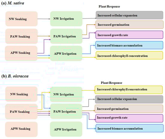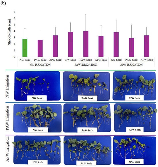Overall, both species showed improvement with PAW irrigation, regardless of the type of water used for seed soaking, suggesting that oxidative stimulation during very early stages of seed germination and growth is a broadly beneficial mechanism, perhaps because of its role in RONS-mediated signalling, activation of antioxidant enzymes, and optimisation of water uptake dynamics [].