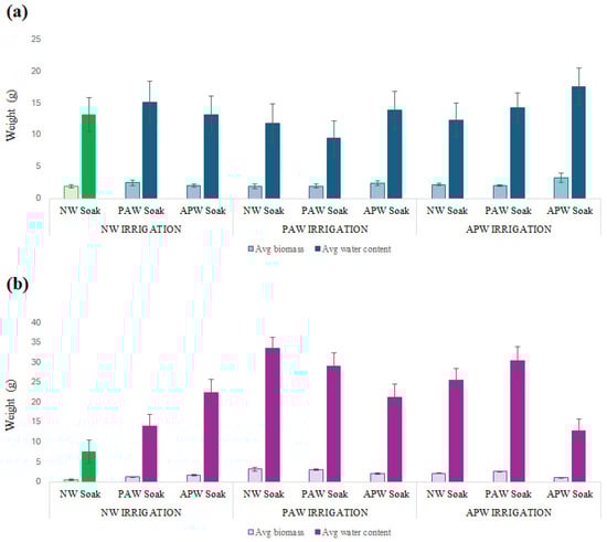 The APW soaking + APW irrigation regimen delivered the lowest level of increase, at +96% for biomass and +70% for water content when compared to control, suggesting that introducing mineral supplementation during both the soaking and irrigation stages may be counterproductive, potentially leading to ionic interference, osmotic imbalances, or precipitation of nutrients that may limit nutrient bioavailability and hinder maximum water uptake. Excessive or unbalanced mineral exposure may reduce nutrient assimilation efficiency and potentially induce physiological stress. This is supported by a much greater improvement in biomass accumulation and water content for APW soaking + NW irrigation (at +216.7% and +196.1%, respectively) and NW soaking + APW irrigation (at +294.7% and +238.2%, respectively).