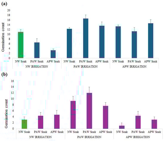 Germination counts in numbers for (a) M. sativa and (b) B. oleracea after 14 sols in soil based on simulated Martian regolith, shown for nine different soaking and irrigation regimens (NW, APW, or PAW). For each treatment, 120 seeds of each species were sown at a depth of 3 mm and monitored over 14 Martian sols under controlled conditions (light intensity 590 µmol m−2 s−1; temperature cycle 20 °C/12 °C). Values are presented as mean ± SD. Green colour represent control.