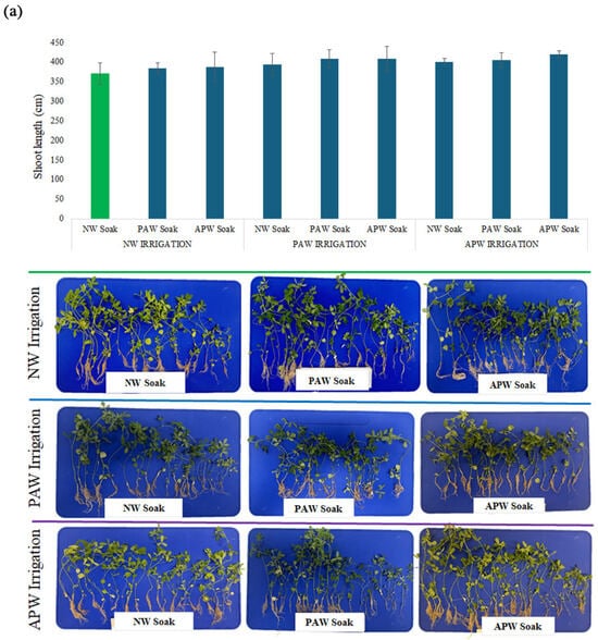 As is evident from examination of the shoot length results summarised in Figure 4 and Table 4, the impact of the choice of the soaking and irrigation regimen was significantly greater in the case of B. oleracea when compared to M. sativa, highlighting once again the differences in the needs of different crops at different stages of their development. In the case of M. sativa, the chemistry of water used for soaking and irrigation played a very minor role in determining the shoot length, with the highest value of the average shoot length produced in plants subjected to APW soaking followed by PAW irrigation, at 17.9 ± 4.4 cm. This was only marginally higher (+3.8%) than the average shoot length in plants from the control group using NW for both soaking and irrigation, at 17.3 ± 5.1 cm. Broadly, exposure to nano-/micro-bubbles would have elevated plant levels of gibberellins, which are directly responsible for increased plant nutrient absorption and stem elongation []. Subsequent sustained exposure to RONS may also have promoted shoot elongation, suggesting a conditioning synergy between oxidative stress and the presence of nano-/micro-bubbles.