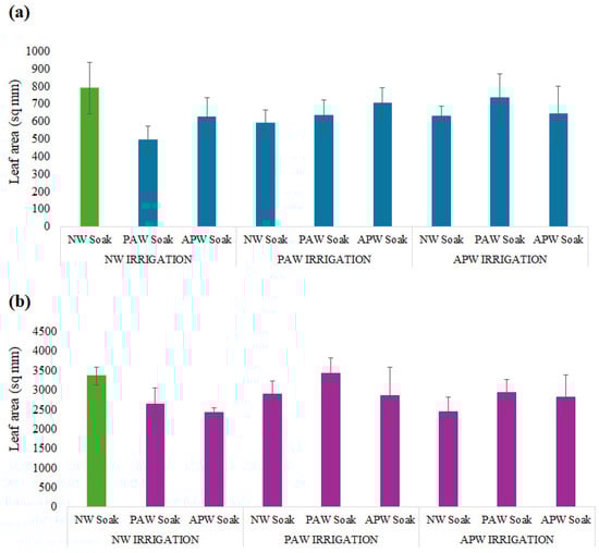 For B. oleracea, a regimen where PAW was used for both soaking and irrigation produced plants with an average leaf area similar to that in the control group, at 3440 ± 392 mm2, corresponding to a slight increase of 2% compared to the NW control, at 3368 ± 232 mm2. As previously noted, exposure of seeds to PAW via soaking can break seed dormancy, enhance germination success, and stimulate cotyledons. Post-germination, ROS/RNS in PAW irrigation can promote cell expansion and nutrient uptake and possibly trigger signalling pathways and metabolic processes [] associated with leaf growth and development []. PAW also has the capacity to enhance nutrient supply and uptake by altering the physico-chemical characteristics of soil, resulting in a greater leaf area []. Interestingly, when PAW was used in combination with NW, either as PAW soaking + NW irrigation (−21%) or NW soaking + PAW irrigation (−13%), there was a reduction in the average leaf area when compared to the control group. This suggests that, where the use of NW for both soaking and irrigation delivers a stable and consistent environment, switching between NW and PAW may potentially introduce a degree of stress requiring mobilisation of plant resources and an adaptation period for the plant to transition from one type of water to another.