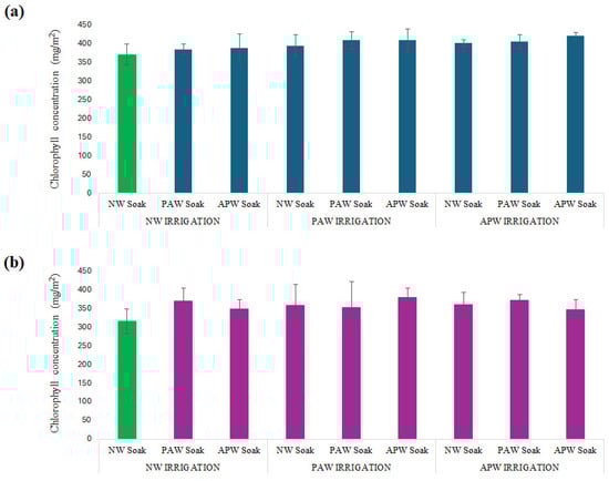 The minimal difference in chlorophyll content also suggests that the differences in biomass or shoot growth reported here may not be regulated by photosynthetic pigment accumulation. Instead, such growth differences may be due to increased water uptake, nutrient assimilation, or early development of the root system, most significantly in PAW-treated plants [,]. The RONS present in PAW may have the capacity to modulate stress responses and enhance early metabolic processes [], specifically in species such as B. oleracea with tougher seed coats.