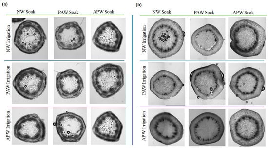 The stem cross-sections of plants exposed to PAW seed soaking exhibited a vascular thickened area and an increase in tissue density, which could be a common physiological response to repeated RONS exposure. The stems of plants subjected to APW soaking followed by PAW irrigation maintained greater uniformity and vascular definition, suggesting a stabilising action of APW even under stress-inducing irrigation conditions. Generally, PAW soaking caused considerable anatomical changes in both species, particularly with regard to tissue compaction and potential lignification reactions. M. sativa demonstrated the greatest level of structural change as a result of exposure to PAW irrigation, particularly when combined with PAW soaking. By contrast, B. oleracea appeared to be less susceptible to the RONS-mediated effects of PAW irrigation, while PAW soaking enhanced vascular density. In both species, the stems of plants subjected to APW soaking maintained vascular integrity, indicating a potentially protective role of APW soaking against subsequent osmotic or oxidative stress.