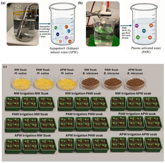 The effect of exposing seeds and plants to water enriched with either biochemically active RONS generated by atmospheric pressure plasma (PAW) or enriched with macronutrients, micronutrients, and charged nano- and micro-scale bubbles generated by the dissolution of feldspar (APW) was then investigated for two plant species, M. sativa and B. oleracea. The plants were subjected to a total of nine regimens of soaking + irrigation, namely NW soaking + NW irrigation (control), NW soaking + APW irrigation, NW soaking + PAW irrigation, APW soaking + NW irrigation, APW soaking + APW irrigation, APW soaking + PAW irrigation, PAW soaking + NW irrigation, PAW soaking + APW irrigation, and PAW soaking + PAW irrigation, to understand if such supplementation is beneficial at different stages of the crop lifecycle.