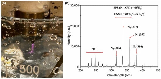 (a) Photograph of the cold atmospheric plasma plume generated in tap water using nitrogen gas. (b) Corresponding optical emission spectrum (200–450 nm) of the plasma plume in proximity to the plasma–liquid interaction zone. The spectrum features the N2 second positive system (SPS, C3Πᵤ → B3Πg) with strong peaks at 337 nm, 357 nm, and 380 nm, the N2+ first negative system (FNS, B2Σᵤ+ → X2Σg+) spanning 300–365 nm, and molecular NO emissions in the 220–260 nm region. Key peak assignments that are N2 (316 nm, 337 nm, 357 nm, 380 nm) are indicated by red arrows.