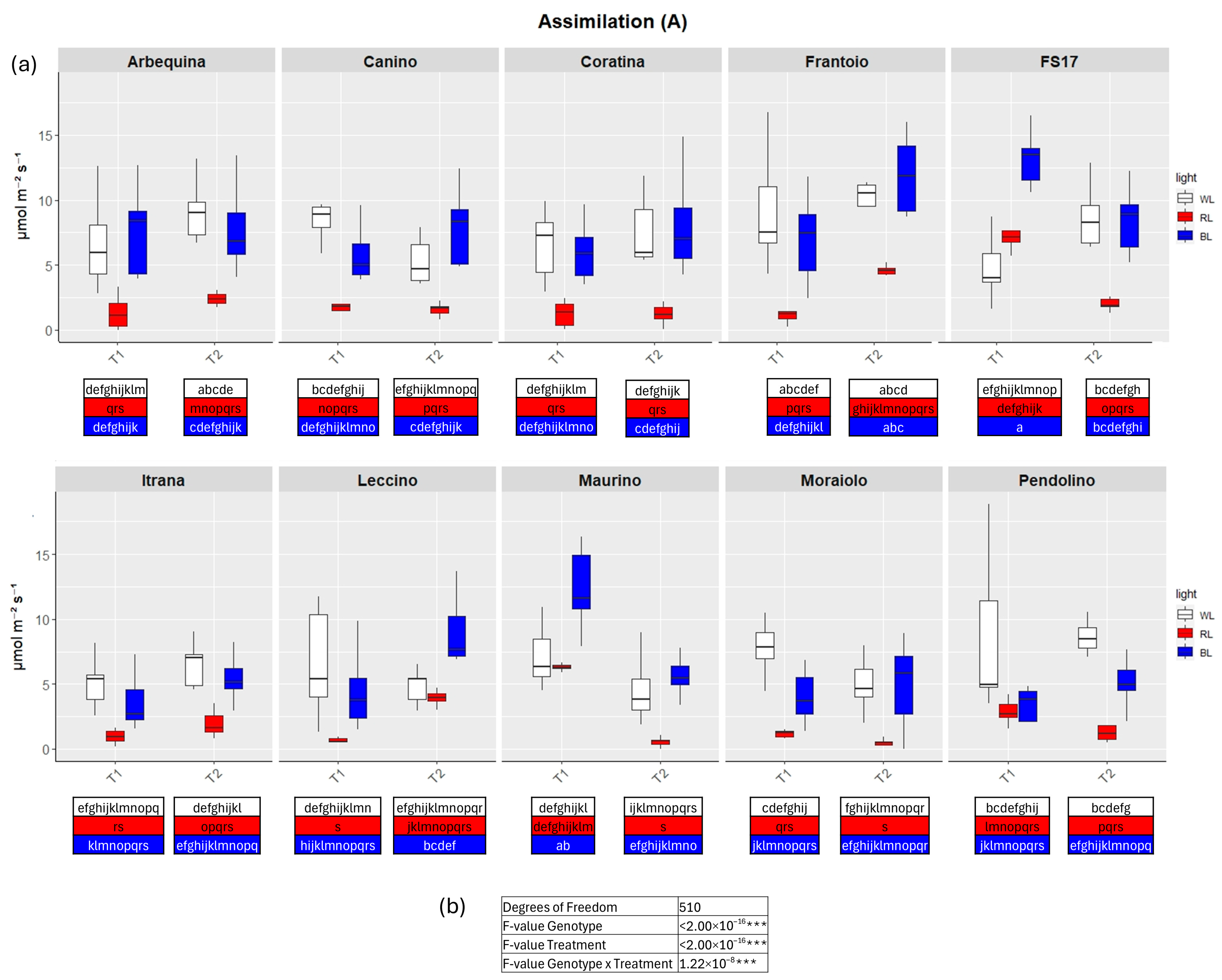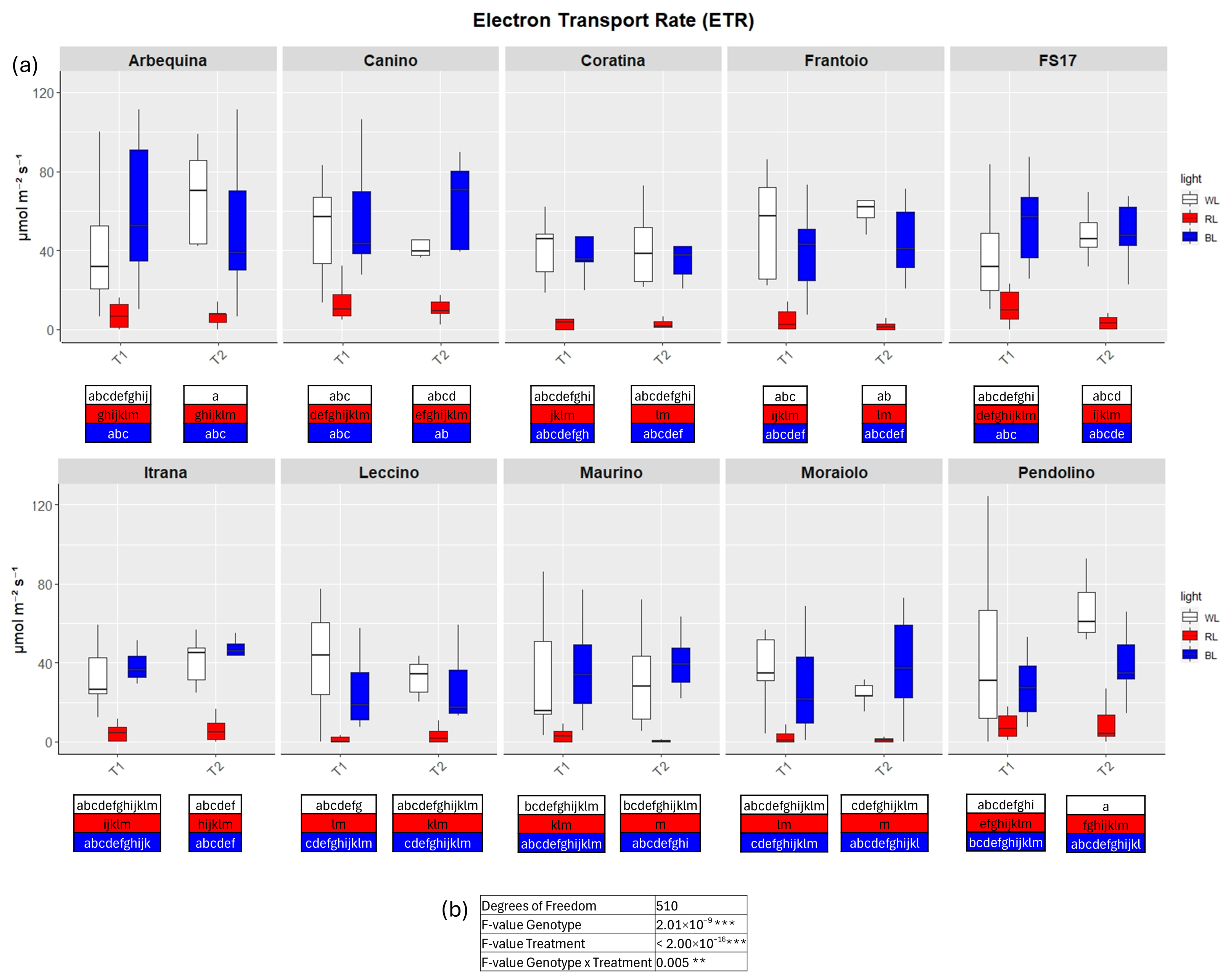 2.1. Physiological Phenotyping of Light Quality Response on Olive Cultivars