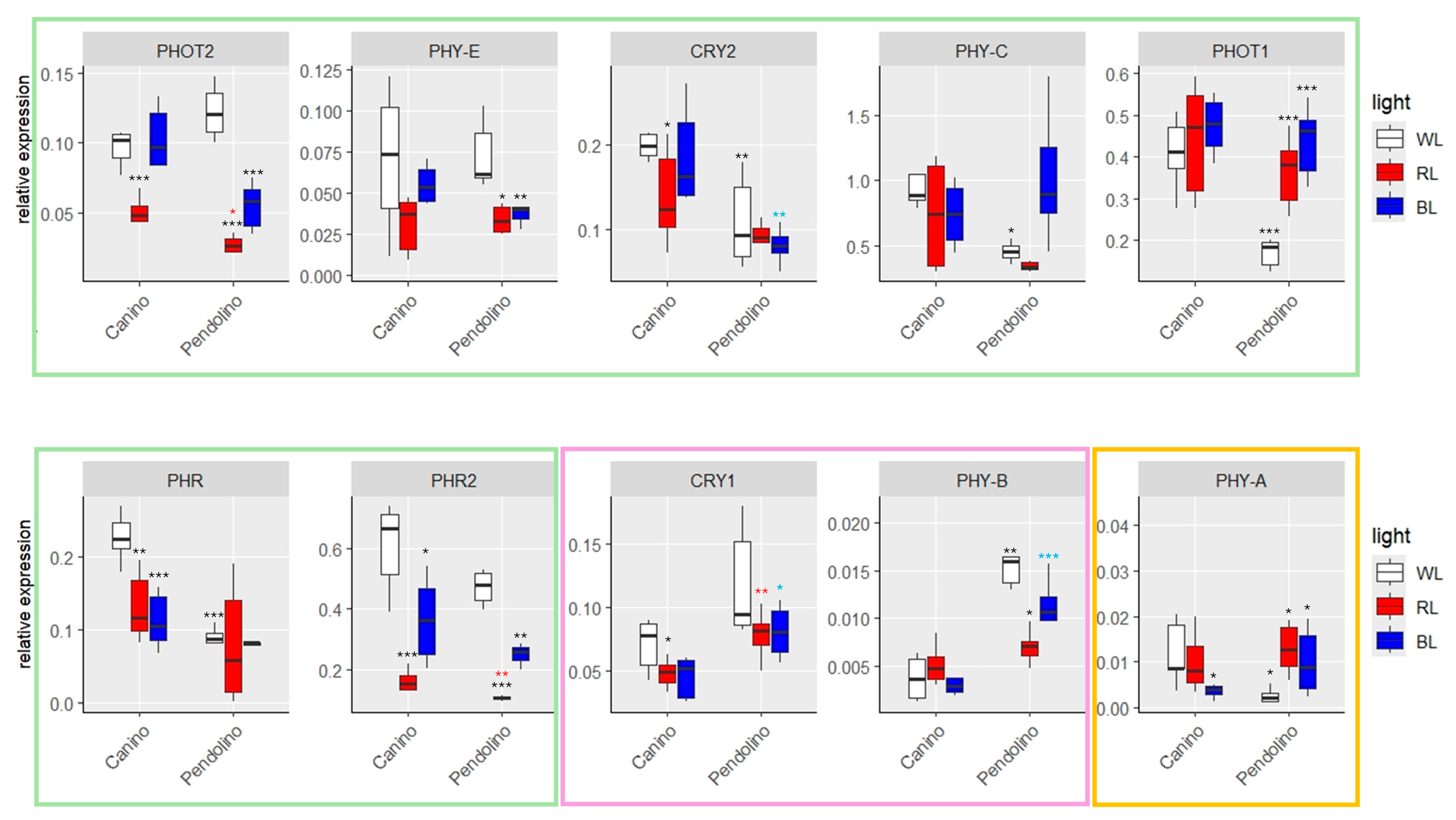 2.2. Gene Expression Analysis of Photoreceptors in Contrasting Light-Responsive Cultivars