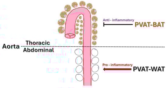 The phenotypic diversity of PVAT includes white, brown, and beige adipose characteristics, which influence its function. In some regions, PVAT shares features with brown adipose tissue (BAT), including generating thermogenic effects during cold exposure or adrenergic stimulation. Brown-like PVAT, which is primarily located in the thoracic aorta regions, is rich in UCP-1 and mitochondria and is associated with increased energy expenditure and vasoprotective effects. BAT uses lipids to generate heat by uncoupling oxidation in the mitochondrial electron transport chain [,]. This process helps remove lipids from the bloodstream, preventing their accumulation in white adipose tissue (WAT) and other organs. White-like PVAT, such as that surrounding the abdominal aorta and mesenteric vessels, tends to produce more pro-inflammatory cytokines and is linked to greater oxidative stress in pathological states compared to BAT-like (Figure 1). Excessive lipid accumulation in WAT leads to adipocyte hypertrophy and dysfunction, resulting in increased secretion of harmful adipokines and pro-inflammatory cytokines. These substances impair vascular endothelial function [].