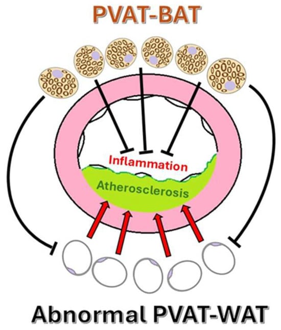 Under normal physiological conditions, PVAT prevents atherogenesis by sequestering fatty acids and possessing thermogenic capabilities [,]. Dysfunction in WAT is linked to the development of atherosclerosis, while activation of BAT appears to have a protective effect, indicating plasticity that can be harnessed for therapeutic benefit (Figure 2). This hypothesis is supported by studies that demonstrate a reduction in hypercholesterolemia and atherosclerosis in hyperlipidemic mice treated with β3-adrenergic receptor agonists [].