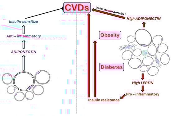 In obesity, PVAT shifts from a vasoprotective to a pro-inflammatory phenotype, characterized by reduced NO availability, increased oxidative stress, and heightened secretion of pro-inflammatory cytokines, such as leptin, TNF-α, and IL-6, while the secretion of anti-inflammatory adipokines, such as adiponectin, is reduced [,,]. Low levels of adiponectin are associated with obesity, diabetes, hypertension, and various cardiovascular diseases, contributing to insulin resistance and diminished glucose utilization in peripheral tissues []. Conversely, elevated levels of adiponectin can also lead to adverse effects, as they have been linked to certain cardiovascular diseases, a phenomenon referred to as the “adiponectin paradox” (Figure 3) []. This imbalance favors the recruitment and activation of immune cells (monocytes, macrophages, and dendritic cells) into the PVAT, thereby intensifying inflammation. Macrophages, especially M1-type macrophages, play a central role in PVAT inflammation, secreting pro-inflammatory cytokines, reactive oxygen species (ROS), and matrix metalloproteinases (MMPs) [,]. These changes drive endothelial dysfunction, VSMC proliferation, and the remodeling of the ECM, leading to increased production of ROS, particularly superoxide and hydrogen peroxide [,]. This dysregulation of adipokine secretion from PVAT contributes to the development of systemic insulin resistance, a hallmark of type 2 diabetes []. Furthermore, insulin resistance within PVAT exacerbates adipocyte dysfunction and local inflammation [,]. Insulin resistance causes disorders in lipid metabolism, also affecting the lipid composition of PVAT []. The bidirectional interaction maintains a vicious cycle in which metabolic imbalance promotes PVAT inflammation, which, in turn, exacerbates vascular injury []. Body mass index (BMI), a surrogate for general adiposity, is closely linked to the expansion of PVAT and inflammatory changes, particularly in the coronary circulation [].