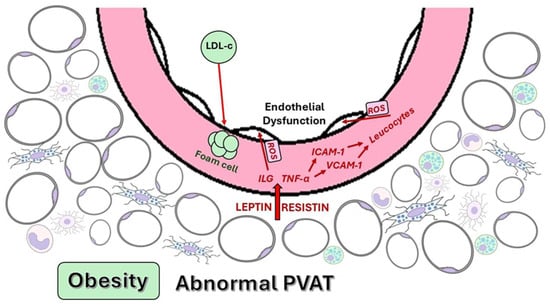 Dysfunctional PVAT serves as a source of pro-inflammatory adipokines and cytokines that negatively affect vascular function. Leptin exhibits a context-dependent duality in its vascular effects, depending on the physiological or pathological context. Normally, it has vasoprotective effects. However, in pathological conditions—such as obesity or metabolic syndrome—elevated leptin levels become pro-inflammatory, increasing the production of pro-inflammatory cytokines, such as TNF-α and IL-6, exacerbating vascular inflammation and contributing to the development of atherosclerosis [,]. TNF-α is a crucial pro-inflammatory cytokine that increases the expression of cell adhesion molecules, such as intercellular adhesion molecule-1 (ICAM-1) and vascular cell adhesion molecule-1 (VCAM-1) (), promoting leukocyte infiltration into the vascular wall and contributing to endothelial dysfunction []. IL-6 has a dual role, participating in both the inflammatory response and metabolic regulation. In the context of dysfunctional PVAT, IL-6 contributes to the development of oxidative stress and endothelial dysfunction [].