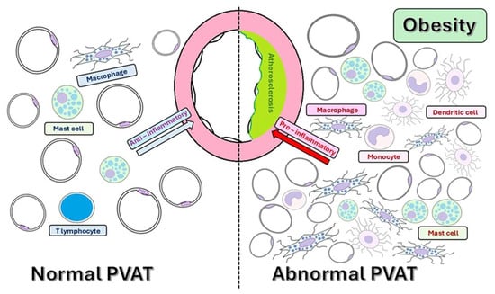 In its normal state, PVAT contains various cells, including adipocytes, macrophages, T lymphocytes, and mast cells. These cells work together to maintain an anti-inflammatory environment, which is essential for healthy vascular function [].