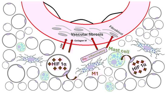 As adipose tissue expands, angiogenesis may not keep pace with the increase in tissue volume, resulting in local hypoxia. This triggers the activation of hypoxia-inducible transcription factors, especially HIF1α, which acts as a master regulator of the pathological microenvironment [,]. HIF1α promotes the expression of lysyl oxidase (LOX, the enzyme that catalyzes covalent bonds in collagen and elastin fibers), MMP-14 (which degrades collagen VI and releases endotrophin), and collagen types I and III, thereby supporting the remodeling of the ECM and promoting fibrosis [].