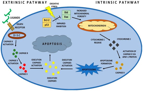 Apoptosis occurs mainly through two pathways: intrinsic and extrinsic. These pathways are regulated by the cascade activation of enzymes from the caspase family, which participate in the process of apoptosis. The intrinsic pathway is activated by increased oxidative stress in the cell, DNA damage, or the action of drugs. Pro-apoptotic Bax proteins are involved in the intrinsic activation of apoptosis, increasing the permeability of the mitochondrial membrane and thus the release of cytochrome c, which induces the intrinsic apoptosis process. Bcl-2 proteins, on the other hand, regulate the permeability of the mitochondrial membrane, acting anti-apoptotically. The release of cytochrome c from the mitochondria leads to the formation of the apoptosome complex and the activation of caspase-9, followed by caspase-3, which is an effector protein. The extrinsic pathway is initiated by death receptors. After ligand binding, they lead to the cascade activation of caspase-9, which directly or indirectly through the t-Bid protein activates the mitochondrial mechanism of apoptosis [,]. A simplified diagram of the intrinsic and extrinsic apoptosis pathway is shown in Figure 1.