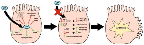 However, there are protective mechanisms in the intestines that prevent excessive cell damage by protecting against oxidative stress. One of these is the synthesis of glutathione (GSH) from glutamine. GSH neutralizes reactive oxygen species (ROS), protecting intestinal cells from excessive damage and apoptosis. Under physiological conditions, the reduced form of glutathione predominates, and its deficiency, resulting from impaired access to its precursor, glutamine, leads to a decrease in cellular oxidative protection and activation of the intrinsic apoptosis pathway [,,]. The diagram of intestinal cell damage caused by increased oxidative stress resulting from glutamine and glutathione deficiency is shown in Figure 2.