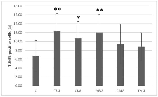 Comparison of the percentage of TUNEL-positive cells in the small intestine of rats in group C—control group; TRG—rats treated with tacrolimus, rapamycin, and glucocorticoid; CRG—rats treated with cyclosporine A, rapamycin, and glucocorticoid; MRG—rats treated with mycophenolate mofetil, rapamycin, and glucocorticoid; CMG—rats treated with cyclosporin A, mycophenolate mofetil, and glucocorticoid; TMG—rats treated with tacrolimus, mycophenolate mofetil, and glucocorticoid. Results are presented as medians and ranges. TUNEL—terminal deoxyribonucleotidyltransferase labeling of dUTP strand ends. * p < 0.05, ** p < 0.005, Mann–Whitney U test.