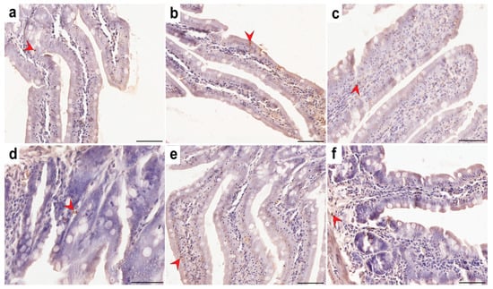 Representative light micrographs showing TUNEL-positive cells (red arrowheads) in the small intestine of rats in group C—control group (a); TRG—rats treated with tacrolimus, rapamycin, and glucocorticoid (b); CRG—rats treated with cyclosporine A, rapamycin, and glucocorticoid (c); MRG—rats treated with mycophenolate mofetil, rapamycin, and glucocorticoid (d); CMG—rats treated with cyclosporin A, mycophenolate mofetil, and glucocorticoid (e); TMG—rats treated with tacrolimus, mycophenolate mofetil, and glucocorticoid (f). Scale bar—50 µm.