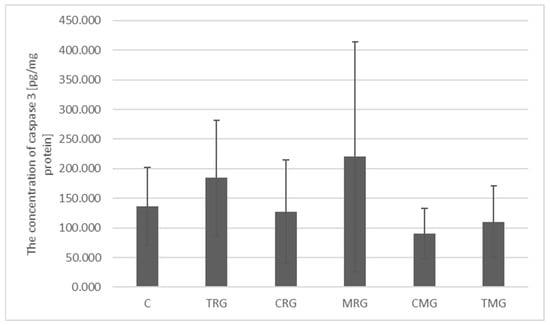 The concentration of caspase 3 in the control group was 136.78 pg/mg protein. Lower concentrations were observed in the CRG (127.53 pg/mg protein), CMG (78.91 pg/mg protein) and TMG (110.45 pg/mg protein) groups; however, they were not significantly different from the control group. Higher concentrations were characteristic of the TRG (184.77 pg/mg protein) and MRG (220.06 pg/mg protein) groups, but these changes were also not statistically significant (Figure 6).