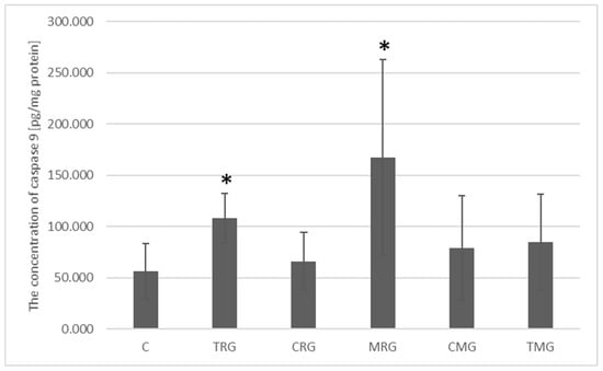 The highest concentration of caspase 9 protein was recorded in the MRG group. It amounted to 167.63 pg/mg protein and was significantly different from the control group’s protein concentration of 56.52 pg/mg protein (p = 0.009). A significantly higher concentration was also observed in the TRG group, where it reached an average of 108.20 pg/mg of protein and was 1.94 times higher than the concentration in the control group (p = 0.015). In the CRG, CMG and TMG groups, the average concentrations were 66.34 pg/mg protein, 78.91 pg/mg protein and 85.01 pg/mg protein, respectively, and were not significantly different from the average amount of caspase 9 protein in the control group (Figure 7).