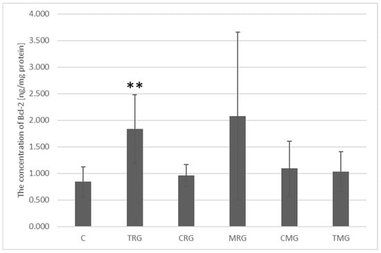 The highest Bcl-2 protein concentration was observed in the MRG group and was 2.083 ng/mg protein; however, this result was not significantly different from the Bcl-2 concentration in the control group, which was 0.842 ng/mg protein. In the TRG group, the Bcl-2 protein concentration was 1.863 ng/mg protein. This value was significantly different from the control group (p = 0.004). The other groups were not significantly different from the control group, and the Bcl-2 concentration in them was: CRG = 0.964 ng/mg protein, CMG = 1.094 ng/mg protein and TMG = 1.032 ng/mg protein (Figure 8).