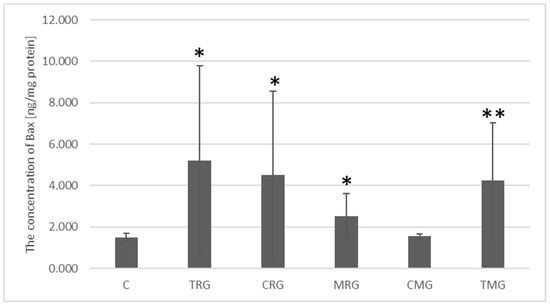 The concentration of Bax protein in the control group was 1.511 ng/mg protein. In the four study groups, the concentration of this protein was significantly higher than in the control group. In the TRG group it was 3.44 times higher (p = 0.03), in the CRG group it was 2.98 times higher (p = 0.04), in the MRG group Bax protein concentration increased 1.68 times (p = 0.04), and in the TMG group it increased 2.82 times (p = 0.002). In the CMG group, Bax protein concentration was 1.03 ng/mg and was not significantly different from the control group (Figure 9).