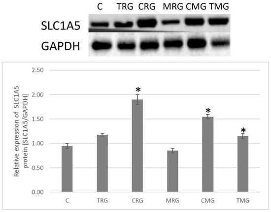 Representative Western blot and graph showing relative expression of SLC1A5 protein in the intestines of rats, C—control group; TRG—rats treated with tacrolimus, rapamycin, and glucocorticoid; CRG—rats treated with cyclosporine A, rapamycin, and glucocorticoid; MRG—rats treated with mycophenolate mofetil, rapamycin, and glucocorticoid; CMG—rats treated with cyclosporin A, mycophenolate mofetil, and glucocorticoid; TMG—rats treated with tacrolimus, mycophenolate mofetil, and glucocorticoid. Data represent mean ± standard deviation. * p < 0.05, Mann–Whitney U test.