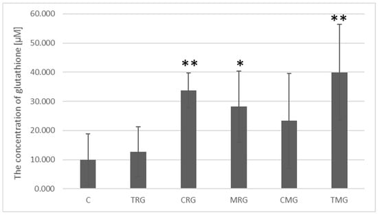 Glutathione concentrations in the control group averaged 9.98 µM. Significantly higher glutathione concentrations were present in the intestinal tissue of animals from the CRG groups, where the increase was 3.38-fold (p = 0.002), MRG, where a 2.82-fold increase was noted (p- = 0.03), and in the TMG group, where the increase was the highest (4-fold) (p = 0.009). Higher glutathione concentrations were also noted in the CMG and TRG groups relative to the control group, but the differences were not statistically significant (Figure 11).