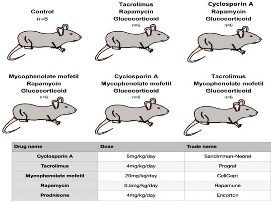 The study was conducted on 36 male rats aged 14 weeks. The average weight of the individuals was 305 g. The animals were purchased from a licensed breeder and then transported to the animal house of the Pomeranian Medical University in Szczecin. The rats were divided into 6 groups and placed equally in 6 cages each. The air temperature in the animal room was 22 °C, humidity reached 55%, and the light day was divided 12/12. All rats experienced a two-week adaptation period, during which they received LSM laboratory diet (17.6% protein, 1474 kJ/100 g) and water. Five groups of subjects were exposed to immunosuppressive drugs and one untreated control group. Animals in each of the 5 groups were then given an oral form of one of the three-drug immunosuppressive regimens once daily (Figure 12). The control group was not treated with any drug. The drug doses used allowed the therapeutic concentrations of each substance to be reached in the blood.