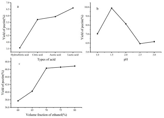 Figure 1a, organic acids were the most effective for pectin extraction. Among these six acid types, lactic acid was the most effective for pectin extraction from NDFP. However, acetic acid is a safe edible acid and is less expensive than lactic acid. Therefore, acetic acid was selected for further use. pH is one of the most crucial parameters affecting the amount and properties of extracted pectin, whose yields are high at low pH values. The maximum pectin yield was obtained at pH 1.5 (