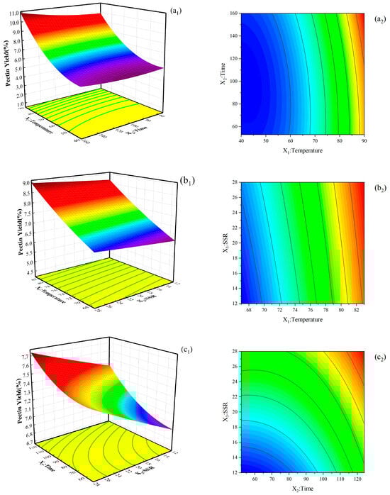 Figure 3 illustrates the interactive effect of independent variables on pectin yield, two of which were fixed. The yield of pectin increased with temperature, time, and SSR. This phenomenon may be due to the increase in the solubility and diffusivity of pectin from plant cells to solvents with the increase in temperature. The longer the contact time, the greater the mass transfer of solid particles into the solution. The high SSR increases the yield by increasing the contact surface between plant cells and solvents and promotes the expansion of plant cells, resulting in cell rupture. As a consequence, the dissolution of pectin is enhanced. These results are consistent with those obtained in sour orange peel by Colodel et al. [