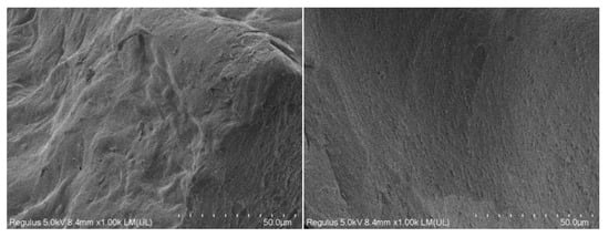 Figure 5 left) exhibited a rather rough structure with a bumpy, uneven surface. The different appearances of the two pectin samples could be attributed to the differences in their structures.