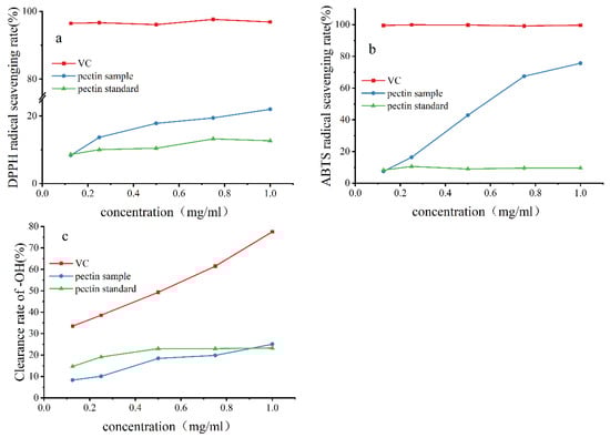 Figure 6). The free radical scavenging ability of the two increased with their concentration. The antioxidant activity of the pectin sample was stronger than that of the pectin standard, but both had lower antioxidant activity than vitamin C. The effect of low pectin concentration on ·OH scavenging was not good. A possible reason is that the concentration of pectin did not reach the concentration needed to capture ·OH in competition with salicylic acid, which was dominating the competition. When the mass concentration reached 1.0 mg/mL, the ·OH scavenging rate of the pomelo pectin sample (25.07%) was slightly higher than that of the standard pectin (23.28%). With the increase in the concentration of pomelo pectin, its ·OH scavenging effect will be continuously enhanced.